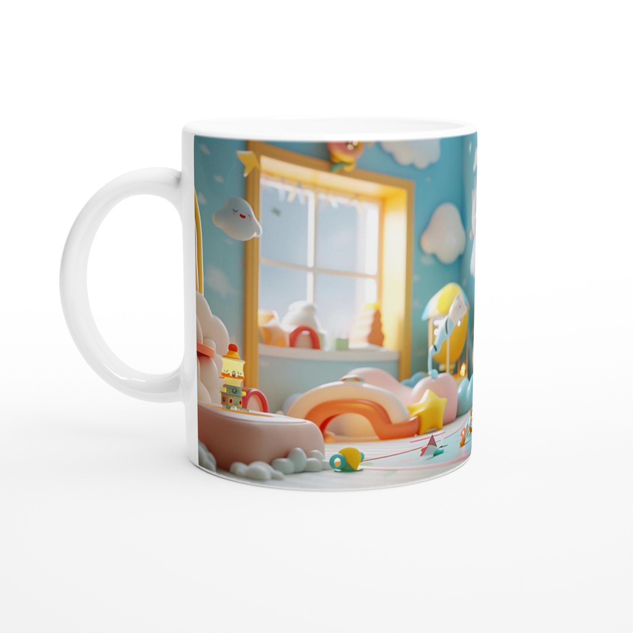 Kliv in i en värld av fantasi med denna underbara keramiska mugg, inspirerad av en lekfull och sagolik barnkammare fylld med moln, regnbågar och mjuka pasteller. Den här muggen blir snabbt en vardagsfavorit och skapar en känsla av lugn och glädje, perfekt för morgonkaffet, kvällens varma choklad eller när du bara vill njuta av en kopp te. Den blanka ytan framhäver trycken med klara och levande färger, som håller sig fina även efter många turer i mikron och diskmaskinen, vilket gör den idealisk för både vuxna och små drömmare.Muggen är inte bara praktisk – den är också en uppskattad present till familj, vänner eller kollegor. En enkel men personlig gåva som alltid kommer till användning. För att matcha din personliga stil eller ditt humör kan du välja din favorit bland sju charmiga färger: den klassiska Ceramic White, den soliga Ceramic Yellow, den söta Ceramic Pink, den friska Ceramic Green, den djärva Ceramic Red, den eleganta Ceramic Black eller den lugnande Ceramic Blue. - Klassisk keramikmugg, 11 oz