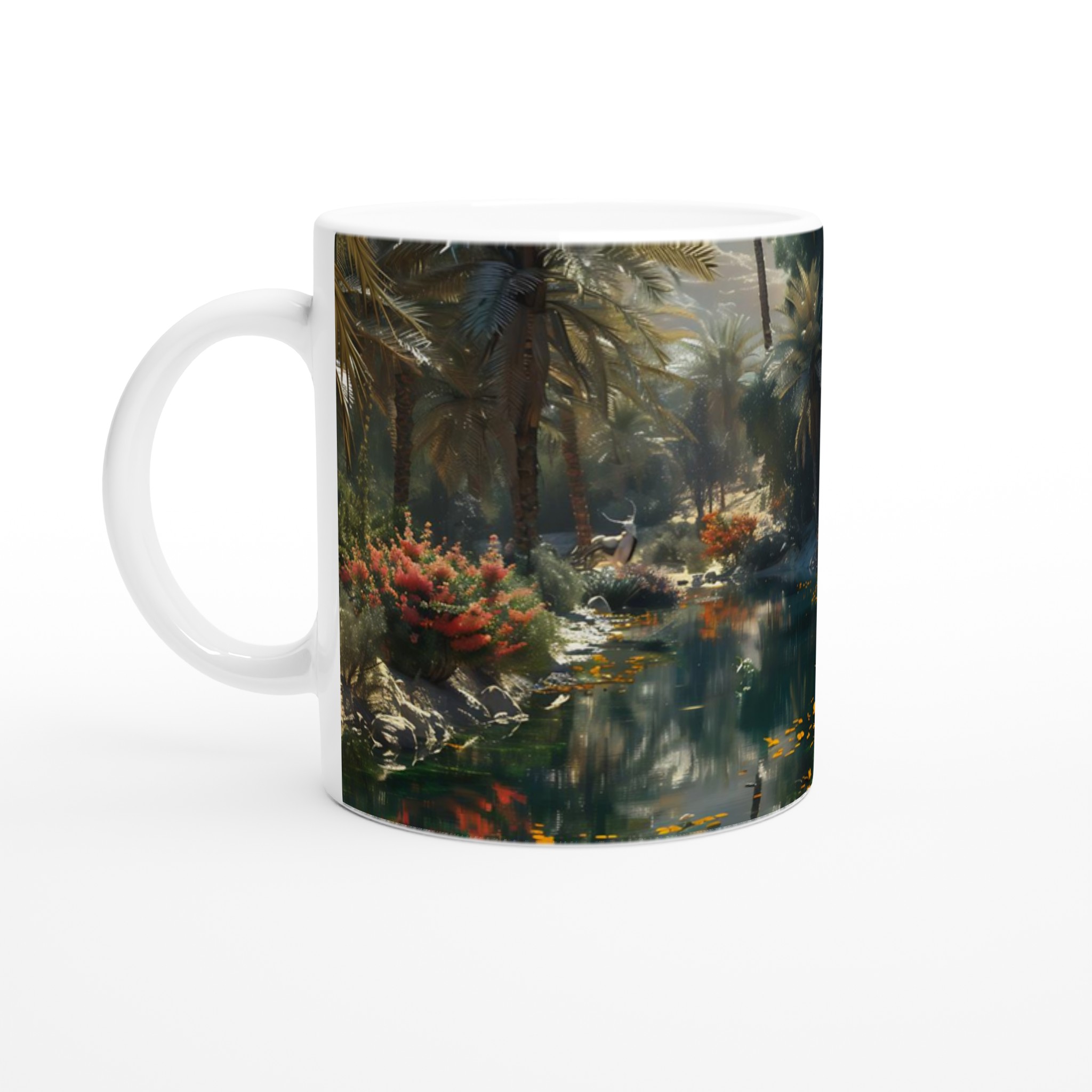 Låt dig svepas bort till en lugnande oas varje gång du tar en klunk. Denna stilrena keramiska mugg, prydd med en djup och fridfull bild av en savann med palmer och antiloper vid en vattenkälla, blir snabbt en vardagsfavorit. Perfekt för morgonkaffet, kvällens varma choklad eller när du bara vill njuta av en kopp te. Den blanka vita ytan gör att trycken framhävs med klara och levande färger, som håller sig fina även efter många turer i mikron och diskmaskinen.