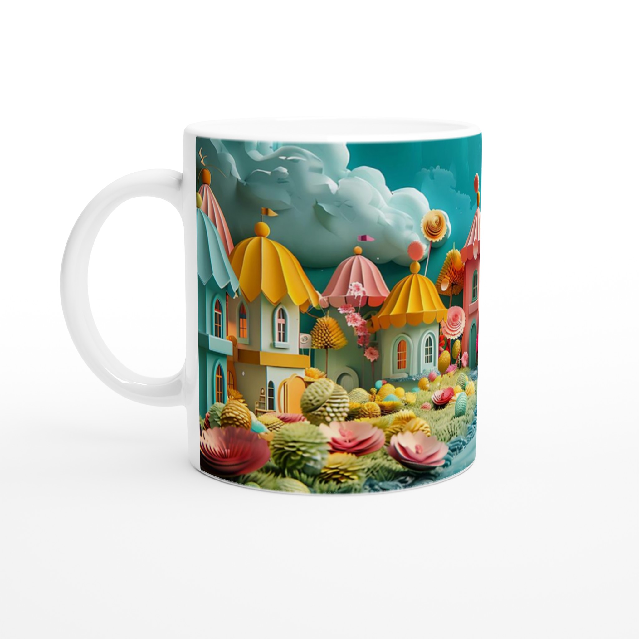 Välkommen till en värld av pastellfärger och fantasifulla detaljer med vår Keramiska Mugg. Denna mugg är inte bara en behållare för din dryck – den är en inbjudan till en liten verklighetsflykt, inspirerad av lekfulla landskap och drömska städer. Låt varje klunk transportera dig till en plats fylld av glädje och skönhet, oavsett om det är morgonkaffet, eftermiddagsteet eller kvällens varma choklad.Den här stilrena keramiska muggen blir snabbt en vardagsfavorit. Perfekt för morgonkaffet, kvällens varma choklad eller när du bara vill njuta av en kopp te. Den blanka ytan gör att trycken framhävs med klara och levande färger, som håller sig fina även efter många turer i mikron och diskmaskinen.Muggen är inte bara praktisk – den är också en uppskattad present till familj, vänner eller kollegor. Välj din favorit bland sju livfulla nyanser, som varje speglar en del av den magiska världens palett: "Ceramic White" för en klassisk touch, "Ceramic Yellow" för solig glädje, "Ceramic Pink" för sötma, "Ceramic Green" för lugn, "Ceramic Red" för energi, "Ceramic Black" för elegans, eller "Ceramic Blue" för himmelska vibbar. En enkel men personlig gåva som alltid kommer till användning och sprider lite extra magi i vardagen.- Klassisk keramikmugg, 11 oz